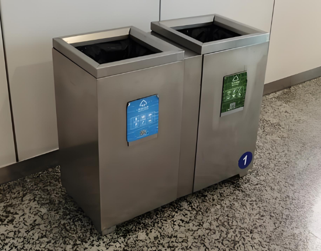 地鐵站日均客流量可達數(shù)萬甚至數十萬人次,對垃圾桶的耐用(yòng)性提出極高要求(qiú)。不鏽(xiù)鋼作為主流材料,憑借其(qí)高強(qiáng)度、耐腐蝕、易(yì)清潔的特(tè)性,成為室內公共設施(shī)的首選。定製兩連體垃圾桶時,通常選用304或316不鏽鋼,這類鋼材具備以下(xià)優勢(shì):
