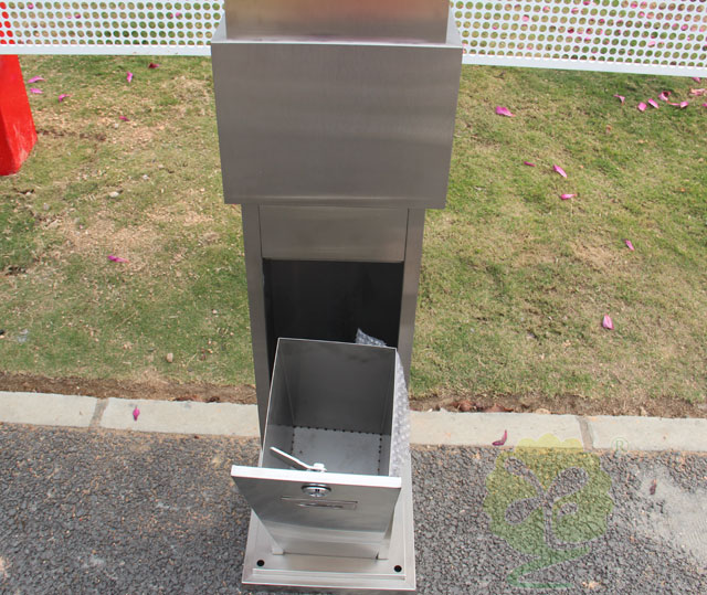 C630戶外立(lì)地式吸煙柱采用優質不鏽鋼剪(jiǎn)切、組裝、焊接、絲印而成,它包括外套管、支座、內套管、煙灰盒、底座。外套管的底端固(gù)定連接在支座上(shàng),外(wài)套管的側壁上設有煙蒂(dì)置入口,內套管用於(yú)集中收納從外套(tào)管(guǎn)的煙蒂置入口投入的煙蒂,內套管設(shè)在外套管的內管腔中,內內套管的開口端朝上,煙蒂置入口與內套管的開口相連通,以使得從(cóng)煙蒂置入(rù)口投入的煙蒂可從內套管的開口端落(luò)入到內套管的內管腔中(zhōng)。
