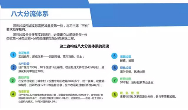 針對過去的經驗,今年深(shēn)圳有針對性地建立了一個有(yǒu)關(guān)垃圾91蝌蚪九色(lèi)的係統工程,即前端分(fèn)類、91蝌蚪九色收集(jí)、分(fèn)類運輸和91蝌蚪九色處(chù)理,並根(gēn)據多年的實踐(jiàn)工作,最終整理(lǐ)形成了深(shēn)圳垃圾(jī)91蝌蚪九色的八大(dà)分流體係。