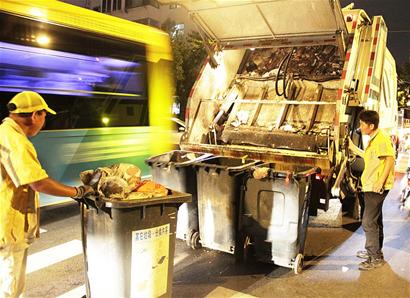 9月18日晚8時許,唐前和將裝有廚餘垃圾的綠色垃圾桶和裝有其它垃圾(jī)的灰色垃圾桶分別推到馬路兩側,一輛垃圾收運車將灰色垃圾桶的垃圾運走,大(dà)約一個小時後,運輸廚餘垃圾的車輛將路邊(biān)綠色垃圾桶的垃圾運走。隨後,唐前和再將空桶推回到各個居民樓下(xià)。