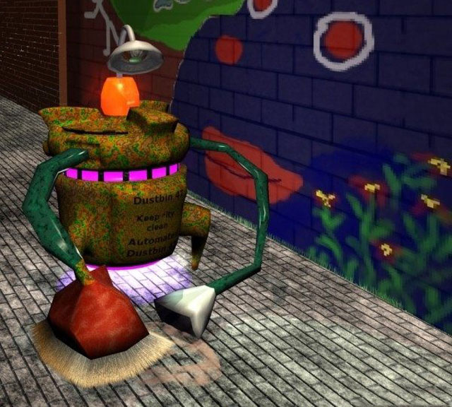 未來的垃圾桶十分奇怪,有八隻機器爪子撐著地,可以疾走如(rú)風;四條機(jī)器(qì)手臂來回舞動,用於撿拾地上的垃圾;頭上的磁力線為它辨別方向,一個大嘴似的大孔用來(lái)吸收垃圾,圓柱的身體用來裝載垃圾。