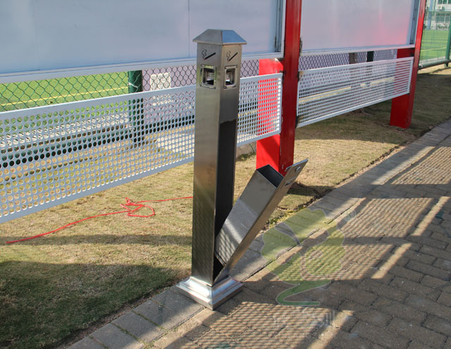 C633-1廠家定(dìng)製滅煙柱采用優質不鏽(xiù)鋼剪切(qiē)、組裝、焊接、絲(sī)印而成,它包括外套管(guǎn)、支座(zuò)、內套管、煙灰盒、底座。外套管的底(dǐ)端固定連(lián)接在支座上,外套管的側壁上設有煙蒂置入口,內套管用於集中(zhōng)收納從外套(tào)管的煙蒂置入口投入(rù)的煙蒂,內套管設(shè)在外套管(guǎn)的內管腔中,內內套管的開口端朝上,煙蒂置入口與內(nèi)套管的開口相(xiàng)連通,以使得(dé)從煙蒂(dì)置(zhì)入口投入的煙蒂可從內套(tào)管的開口端落入到內套管的內管(guǎn)腔中;