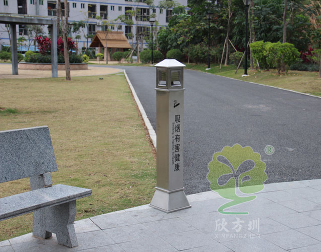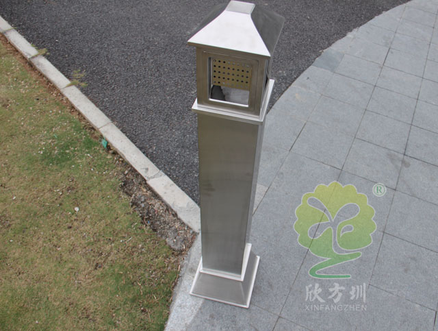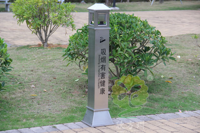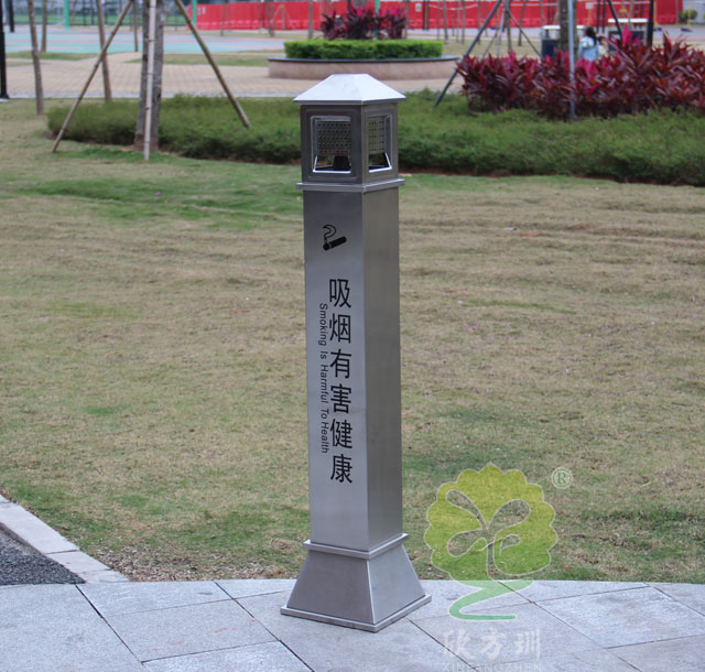C631公共(gòng)場所滅煙柱采(cǎi)用優質(zhì)不鏽鋼(gāng)剪切、組裝、焊接、絲印而成,不鏽鋼具有很好的堅固耐用,防(fáng)水防(fáng)鏽,時尚(shàng)美觀作用。它包括外套管、煙(yān)灰投放口、內筒、煙灰盒。外套管的底端固定連接在(zài)支座上,外套管的側壁上設有煙蒂置入口,內(nèi)套管(guǎn)用於集中收納從外套管(guǎn)的(de)煙(yān)蒂置入口投入的煙蒂,內套管設(shè)在外套管的內管腔中,內內套管的開口端朝上(shàng),煙蒂置入口與內套管的開口相連通,以(yǐ)使得(dé)從煙蒂置入口投入的(de)煙蒂可從內套管的開口端落入(rù)到內套管(guǎn)的內管腔中。