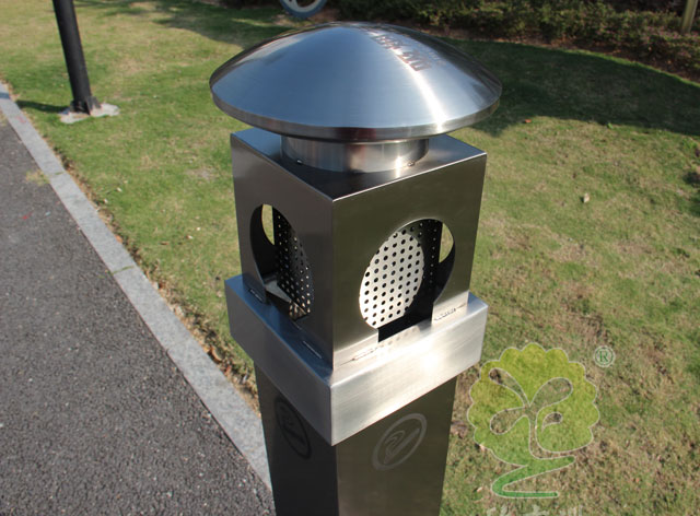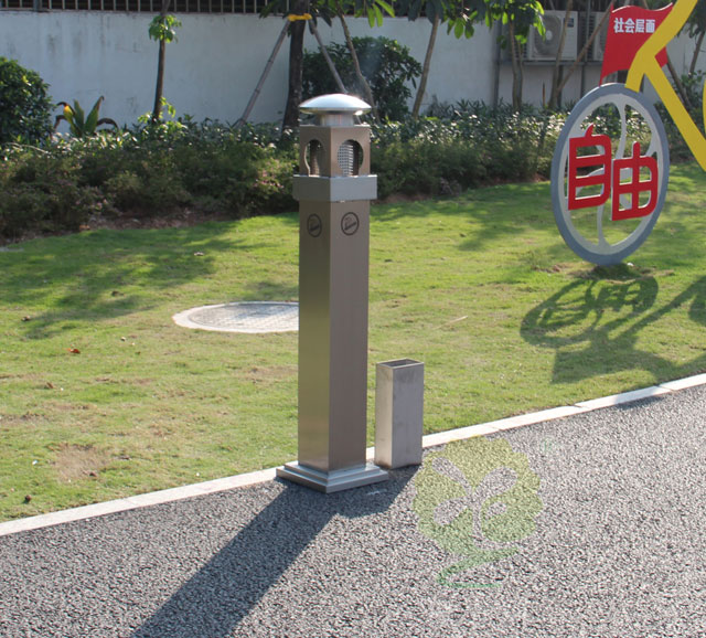 C618室外(wài)街道滅煙柱采用優質不鏽鋼剪切、組(zǔ)裝、焊接、絲印而成(chéng),它包括外套管、支座、內套管、煙灰盒、底座。外套管的底端固定連接在支座上,外套管的側壁上設有煙蒂置入口,內套管用於集中收納從外套管的煙蒂置入口(kǒu)投入的煙蒂,內(nèi)套管設在外套管的內管腔中,內內套管的開口(kǒu)端朝上(shàng),煙蒂置入口與內套管的開口相連通(tōng),以使得(dé)從煙蒂置入口(kǒu)投入的煙蒂可從內套管的開(kāi)口端落入到(dào)內套管的(de)內管腔中(zhōng);