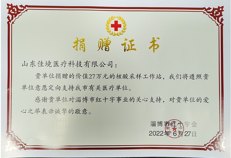 6月27日下午,山東佳境醫療科技有限公司向淄(zī)博市紅(hóng)十字會捐贈(zèng)用於抗擊新冠(guàn)病毒的核酸(suān)采(cǎi)樣工作(zuò)站11台,總價值(zhí)27萬元,支援(yuán)我市疫情的防控工作。淄博市紅十字會二級調研員劉永鋒、佳境醫療董事長鍾文泉先生出席捐贈活動。劉永(yǒng)鋒表示:“非(fēi)常感謝佳境醫療的無私捐贈,這是一(yī)次積極向上、回報社會的愛心行動,對廣大企業積(jī)極參與抗擊疫情、履行社會責任將起到示(shì)範作(zuò)用。鍾文泉表示:“臨近七一建黨節,作為一名黨員,一定要響應黨和政府的號召,盡自己的綿薄之力,向所有抗疫一線的醫護人員表示敬意”。
