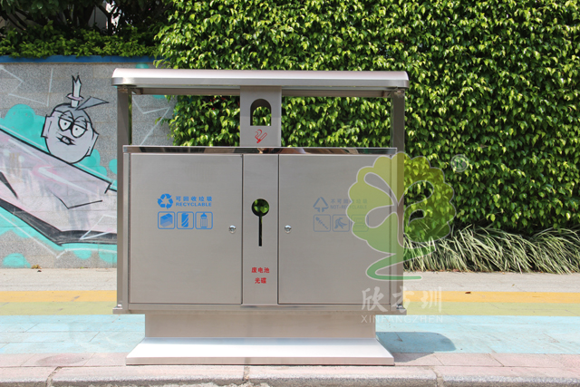 不鏽鋼戶外街道分(fèn)類垃圾桶型號XFZ-C188,規格1000*360*1000,工廠專業工人經過剪板、折彎、焊接、打磨、噴塑(sù)、組裝工序,使桶身光滑亮(liàng)麗,堅固耐用,防火防鏽(xiù)。