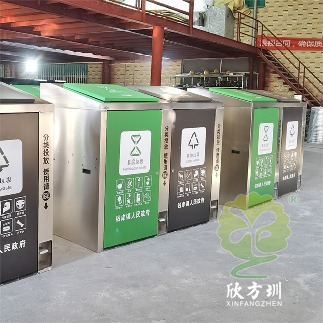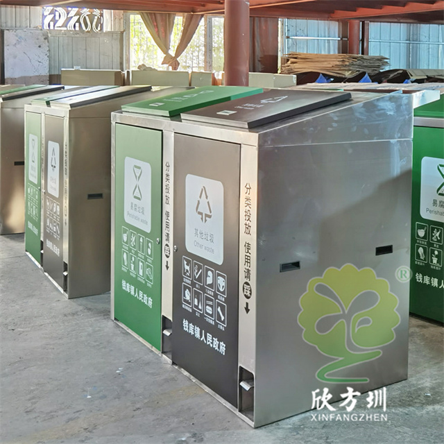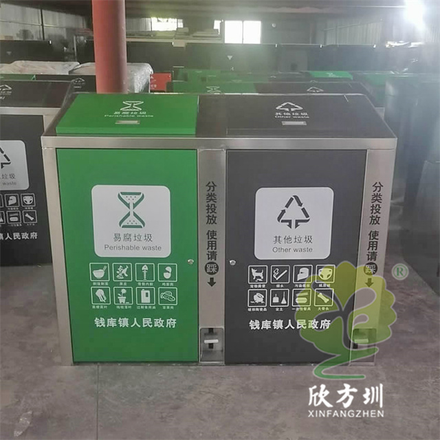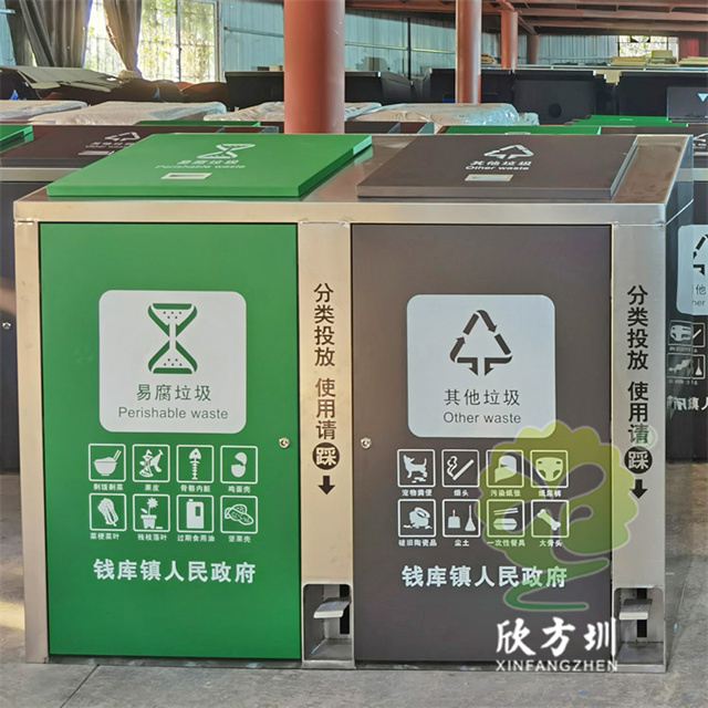 戶外小區腳踏式兩連體不鏽鋼垃(lā)圾桶桶身優質(zhì)201#不(bú)鏽鋼(gāng)足0.95mm厚度(dù)的(de)板生產,框架不鏽鋼(gāng)本色,易腐垃圾門板和蓋子噴塑綠色,其他垃圾門板和蓋子噴塑黑色,蓋子帶嵌(qiàn)入式扣手,兩連體91蝌蚪九色方形(xíng)設計帶腳踏式(shì),門板采用白色的油(yóu)墨絲印(yìn)了最新國標91蝌蚪九色(lèi)標識,腳踏式上方絲印了黑色文字指引。