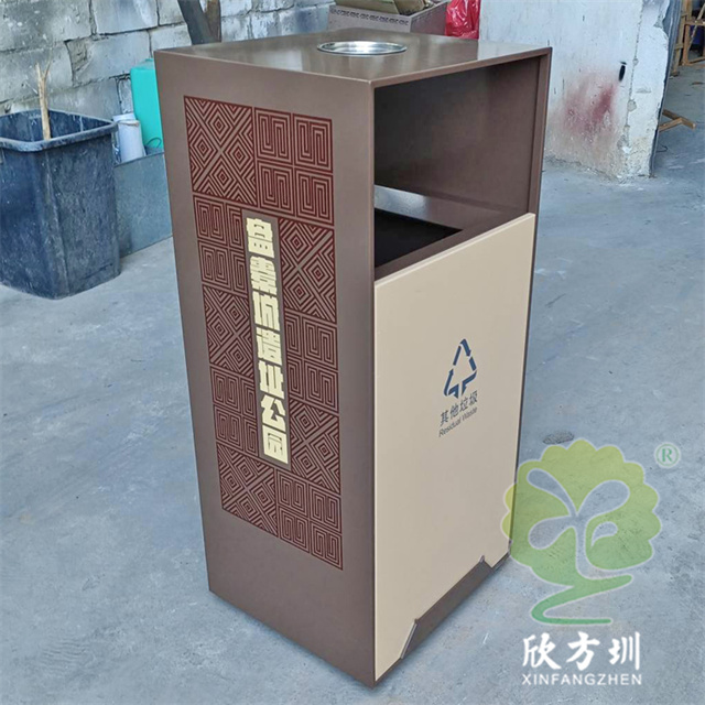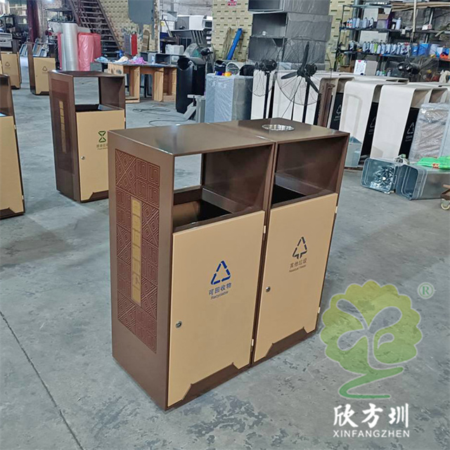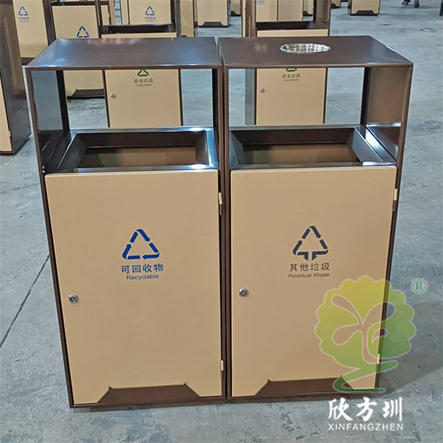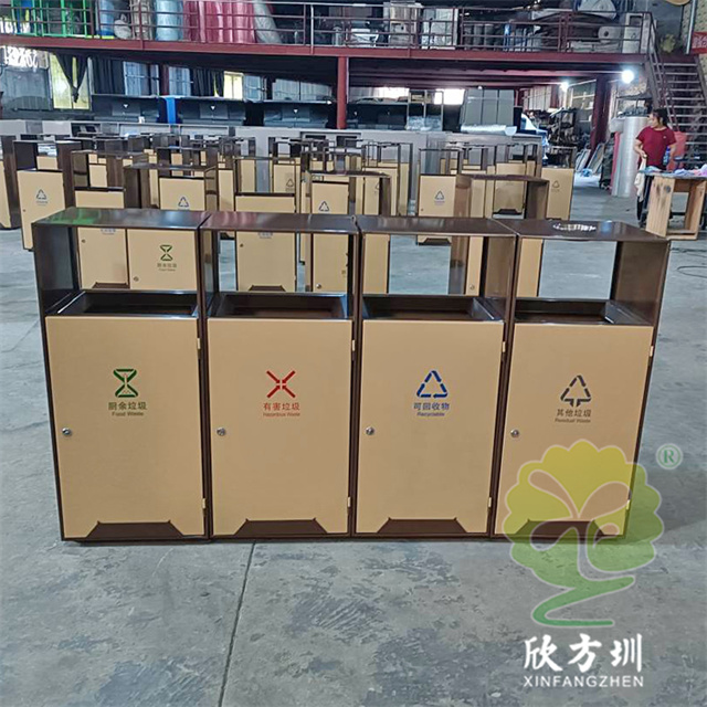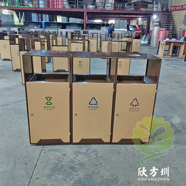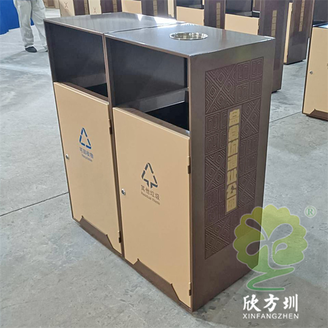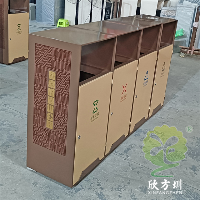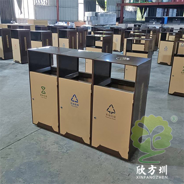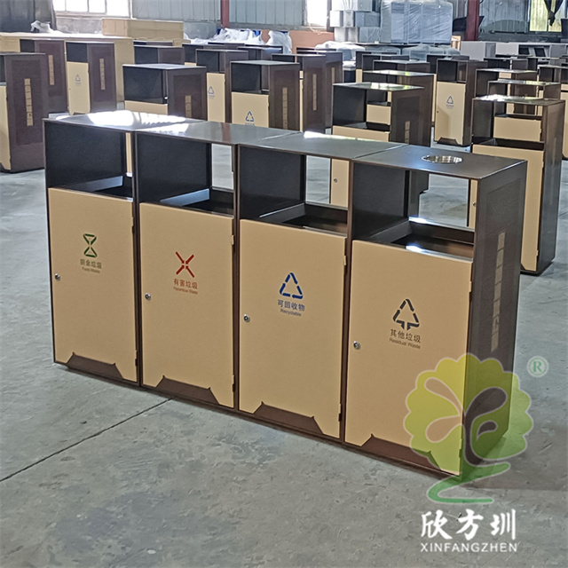戶外(wài)公園噴塑組(zǔ)合式91蝌蚪九色不鏽鋼垃圾桶(tǒng)整體201不(bú)鏽鋼1.0mm厚度,不刨槽折彎,框架邊框折彎15mm,單層,框架噴塑,色號潘通7596C,前後門板也噴塑,色號潘通466C,門(mén)板下(xià)麵裝4mm厚度裝飾條噴(pēn)塑(sù),顏色和框架。