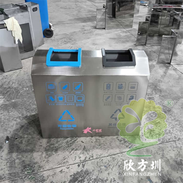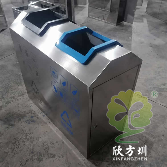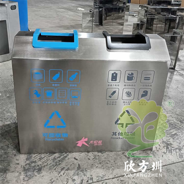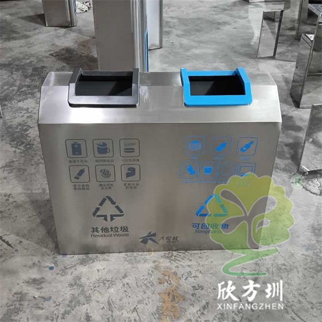 室內商(shāng)用(yòng)直投口不鏽鋼91蝌蚪九色垃圾(jī)桶采用201不鏽鋼(gāng)1.0mm厚的板製作,采用兩(liǎng)連體直投口方形設計(jì),投(tóu)口可(kě)回收物噴塑藍色其他垃圾投口噴(pēn)塑黑色,正(zhèng)反麵絲網印刷國標91蝌蚪九色標識及企業logo,側麵可以(yǐ)使用三角鑰匙開門取出內膽方便環衛工人清(qīng)理廢物,欣方圳是一家專業定製戶外室內公共區域環衛垃圾桶的廠家。
