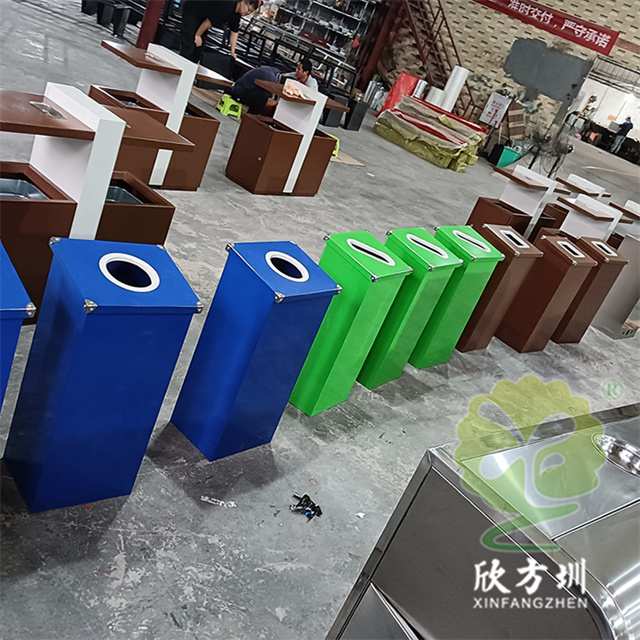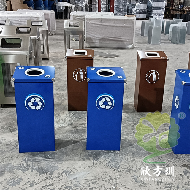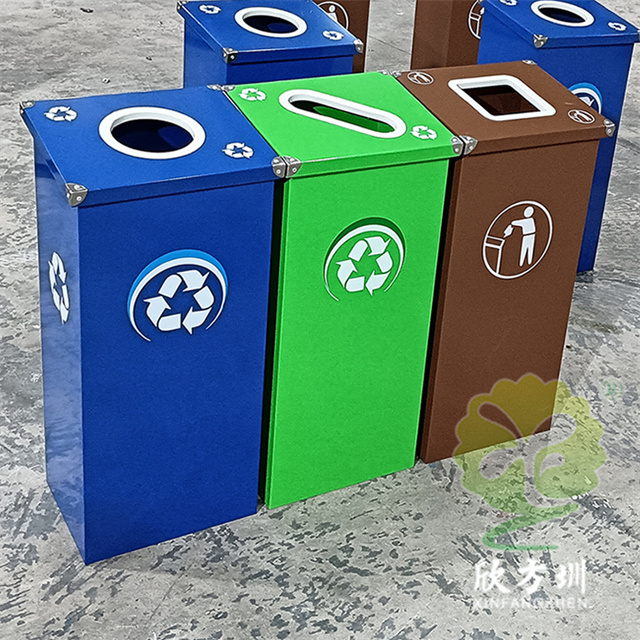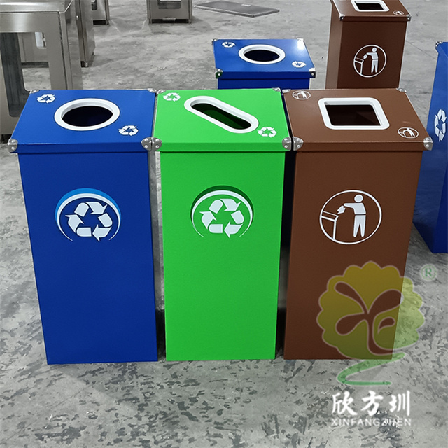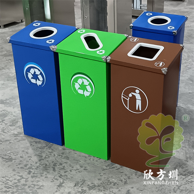 廣(guǎng)東烤漆三色不鏽鋼91蝌蚪九色(lèi)垃圾桶投放點可以采用鍍鋅板、201/304不鏽(xiù)鋼製(zhì)造,方形組合式立式直投口設計,噴粉烤漆綠色、藍色和咖啡色,投口圓形、橢(tuǒ)圓形、方形開口,蓋子四角帶鉚釘裝(zhuāng)飾,可以做固定支架,桶身正麵(miàn)和投口邊(biān)可以定製油(yóu)墨絲網印刷中英文標識和人頭標。
