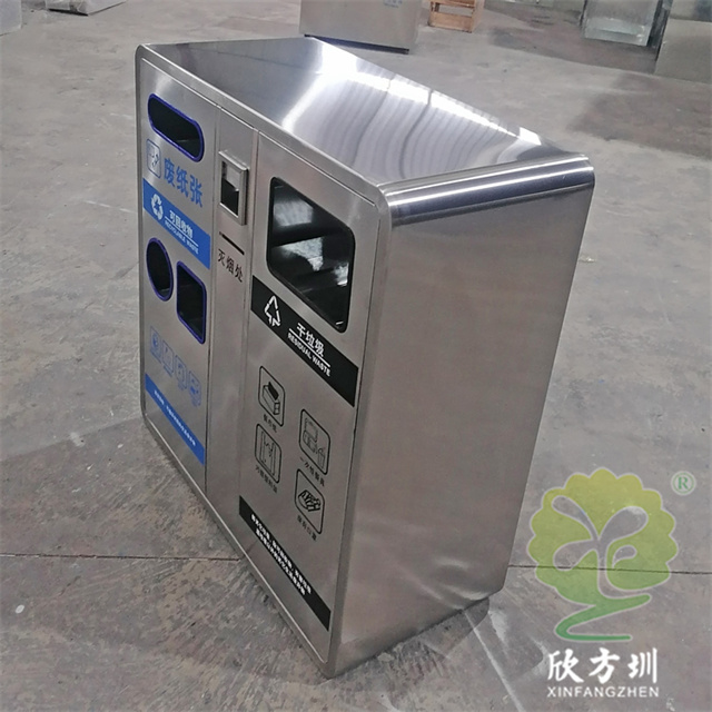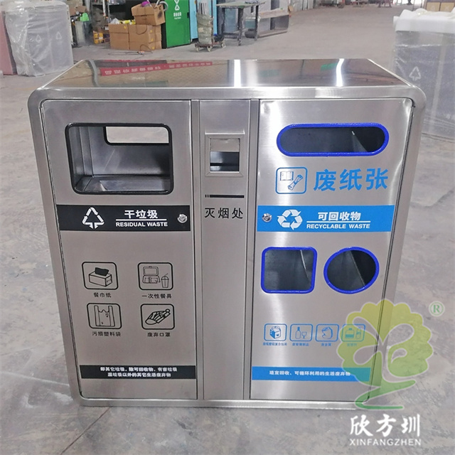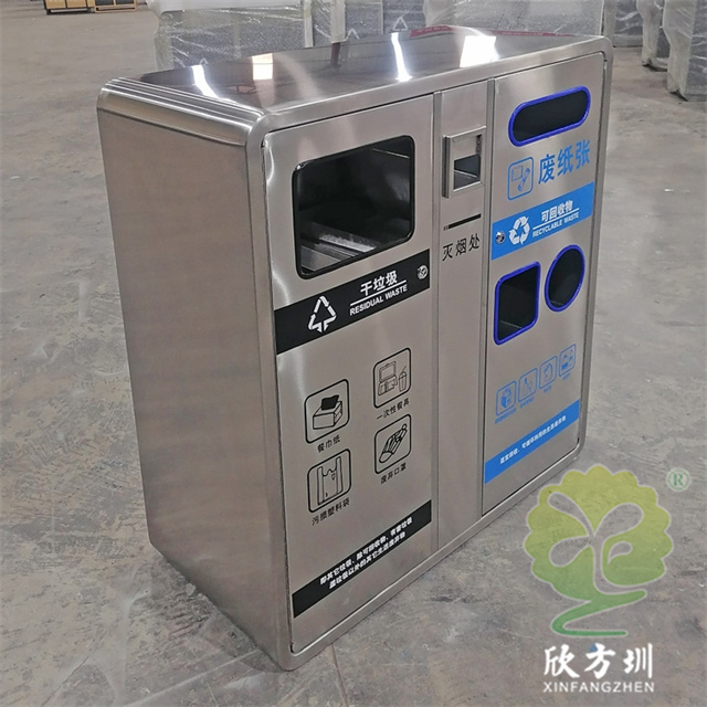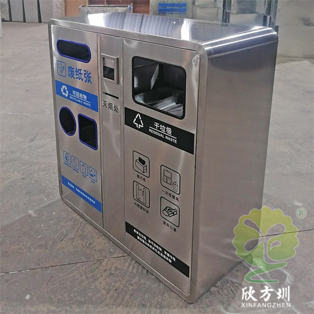 戶外大容量城市街道不鏽鋼分(fèn)類垃圾(jī)桶可以采(cǎi)用201/304不(bú)鏽鋼板製(zhì)造,表麵烤漆(qī)噴塑了就可以做鍍(dù)鋅板材質的,雙麵可回收物多個(gè)投口設計,有長方形廢報紙、方形投口、圓形塑料(liào)瓶投口,方形幹垃圾投口,投口膠條封邊防止割手,中間位置帶滅煙盒(hé),投口顏色可以定製。