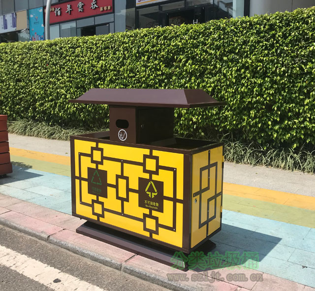 【產品顏色】:以黃色、褐色為主色,覆蓋於桶身;絲印的垃圾桶圖案(àn)用黃色、綠(lǜ)色表示;顏色(sè)對比鮮明和諧,簡潔大方,實用美(měi)觀,還(hái)可根據客戶需求定製。