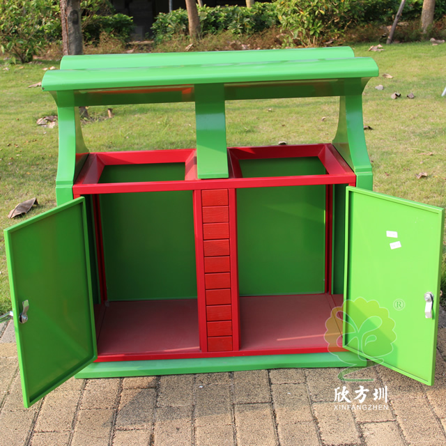 戶外園林冷軋鋼板91蝌蚪九色垃圾箱規格:550*400*1000mm,F189采用(yòng)優質冷軋鋼材料經衝床(chuáng)衝孔、防(fáng)鏽、防腐處理(lǐ)後(hòu)表麵烤漆處理,耐火安全,抗高低溫,適合各(gè)種惡(è)劣氣候條件,堅固耐用,不易破損,具有款式(shì)多樣化,色澤多樣化,經久耐用等優點。垃圾回收箱底部射(shè)有螺栓孔,可(kě)將垃圾桶直接與地麵固定(dìng),在一定程度上也可以防止被偷。本款垃圾回收箱表麵經過除油、噴砂防(fáng)鏽處理後,再進行酸洗磷化處理;表麵清理幹燥後整體進行靜電噴塗或烤漆處(chù)理(lǐ),靜電噴塗是經過流水線高(gāo)溫固化爐固(gù)化後再出(chū)爐(lú)冷卻,加工後的塑粉附著力強,不易(yì)剝落,這樣戶外防鏽效果才會好。該款垃圾回收箱樣式比較簡單,是比較常見的一款(kuǎn)戶外垃圾桶,在街道、小區、物業、廣場等等眾多的公共場合都在用此款垃圾回收(shōu)箱。