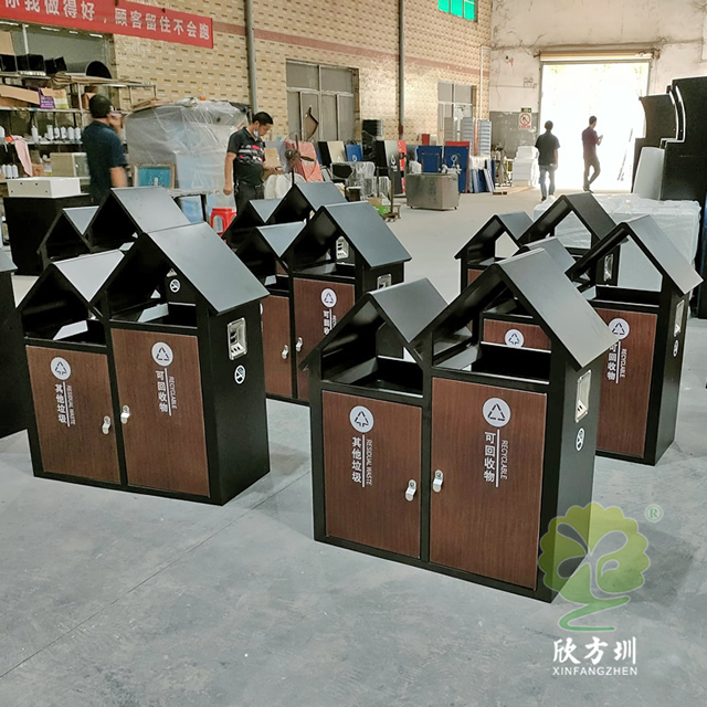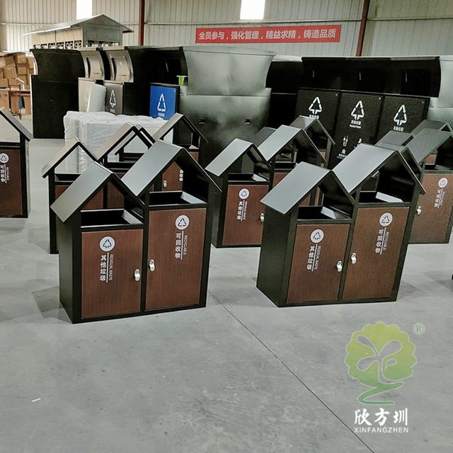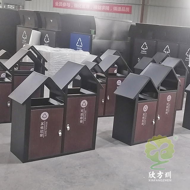 公園景區屋形91蝌蚪九色垃圾箱采用了全新優質1.0mm厚冷軋鋼板製造而成,兩91蝌蚪九色(lèi)連體尖(jiān)頂屋形設計,整(zhěng)體垃圾桶(tǒng)框架黑色噴塗噴(pēn)塑,正麵推拉門板(bǎn)仿轉木紋效果,門板(bǎn)油墨絲印了新國標其他(tā)垃圾、可回收物(wù)分(fèn)類標(biāo)識,三角鑰(yào)匙開門方便取出內置的內筒,可回收箱側麵上方帶一個滅煙盒。